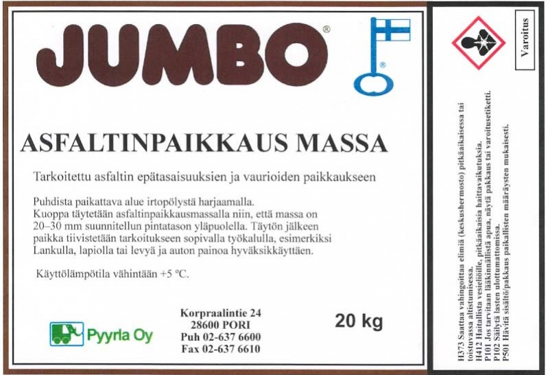 Jumbo Asfaltinpaikkausmassa on tarkoitettu asfaltin epätasaisuuksien ja vaurioiden paikkaukseen.