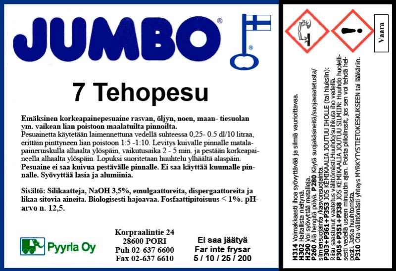 Jumbo 7 Tehopesu on emäksinen korkeapainepesuaine rasvan, öljyn, noen, maantiesuolan ym. vaikean lian poistoon maalatuilta pinnoilta.