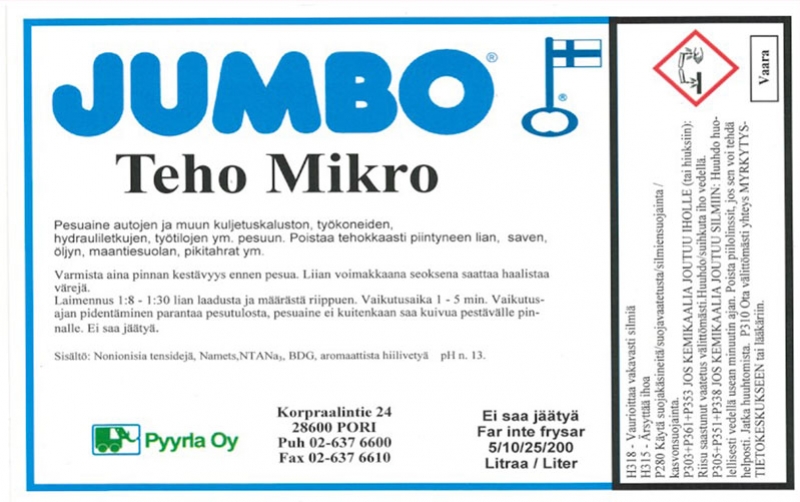 Nonionisia tensidejä, Namets, NTANa3, BDG, aromaatista hiilivetyä. pH n. 13